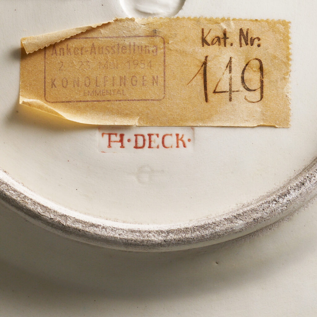 Der Fayenceteller belegt die fruchtbare Zusammenarbeit zwischen dem Maler Albert Anker und dem französischen Keramiker Théodore Deck. Zwischen 1866 und 1892 bemalte Anker für dessen Manufaktur über 500 Keramiken in bestechender Qualität. Kontrastreich heben sich im düsteren Spiegel des Tellers die Umrisse eines Mädchens im Dreiviertelprofil ab. Effektvoll schimmert das Licht auf den geflochtenen Haaren und den fein modellierten Gesichtszügen. Der sinnende Blick des Mädchens streift über den Tellerrand hinaus, auf dem sich drei Putti in einer Rebenranke tummeln.