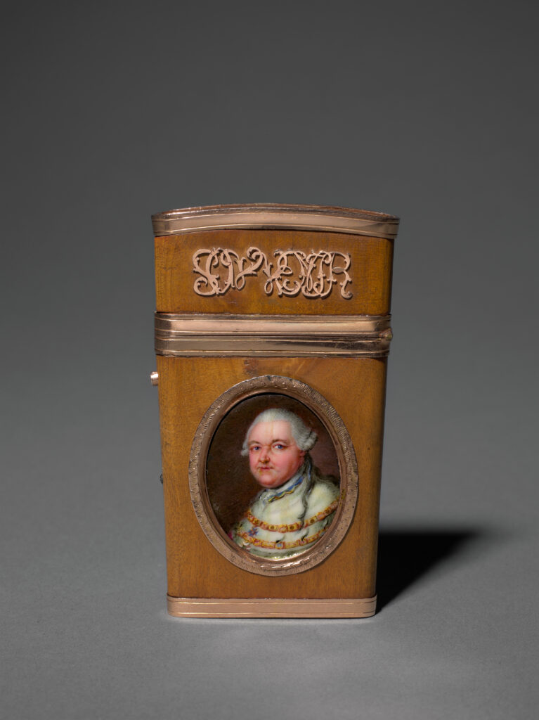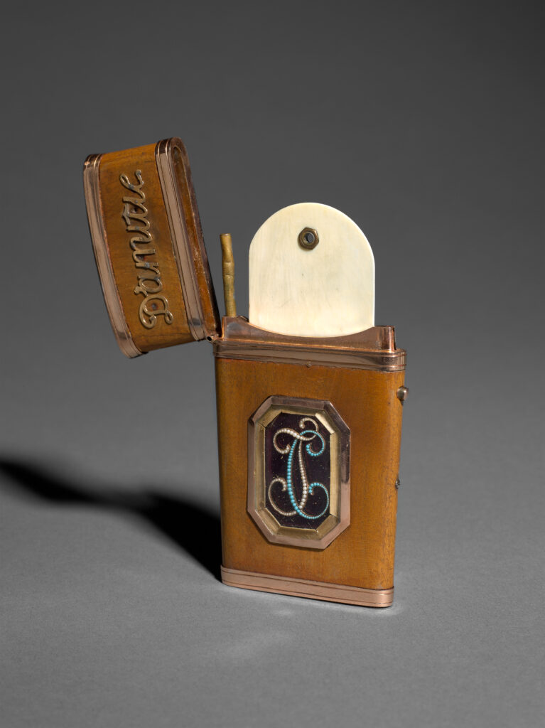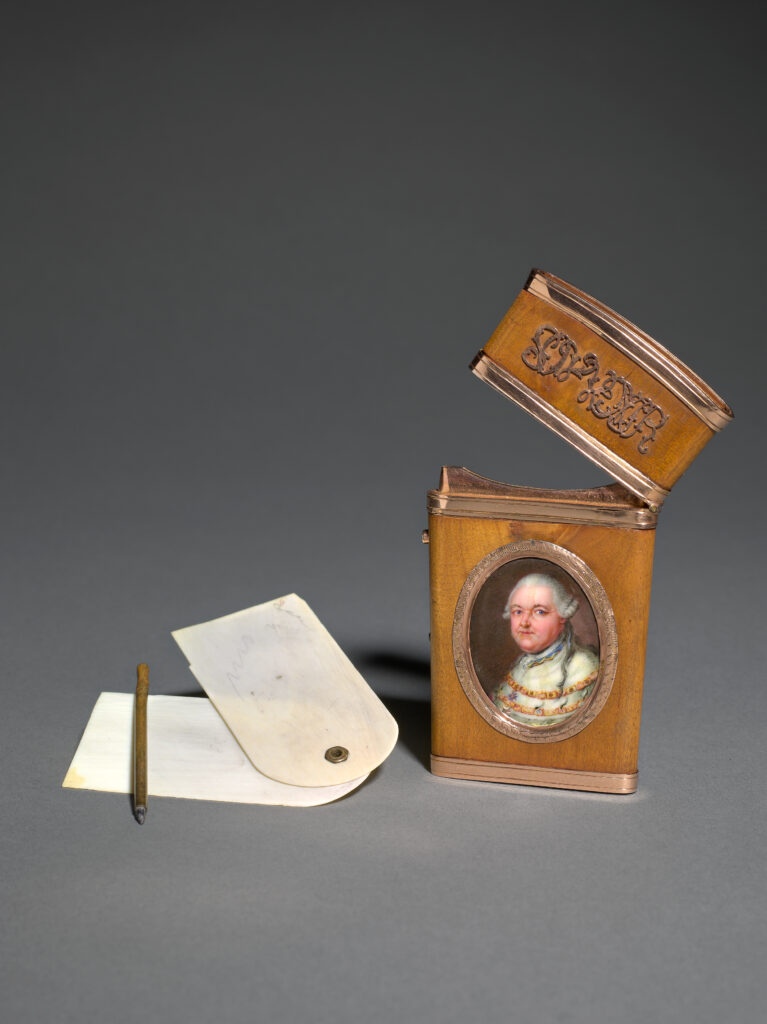 Das Behältnis aus Nussbaumholz ist ein eindrückliches Zeugnis der Freundschaftskultur des 18. Jahrhunderts. Als Zeichen der Wertschätzung verschenkt, diente es zur Aufbewahrung von Beintäfelchen, die mit einem Metallgriffel beschrieben werden konnten. Das Nussbaumgehäuse ist auf beiden Seiten mit Applikationen versehen. Auf der Vorderseite des Klappdeckels findet sich die goldene Beschriftung «Souvenir», auf dem Korpus ein Miniaturbildnis des Kurfürsten Carl Theodor von der Pfalz (1724 – 1799). Die Emailmalerei stammt von Johann Heinrich Hurter (1734 – 1799), dessen eigenhändige Beschriftung auf der Rückseite das Entstehungsdatum verrät: «H Hurter. fecit / 1781.». Ebenfalls von Hurters Hand ist das ligierte Monogramm «CT» des Porträtierten auf der Rückseite.