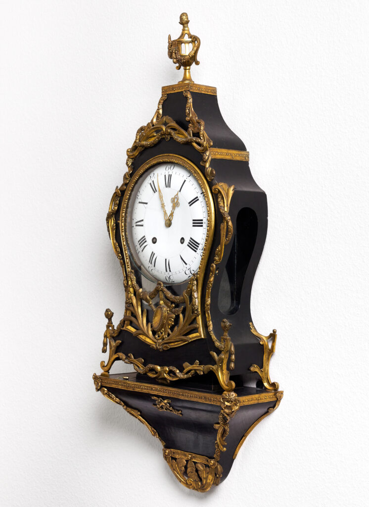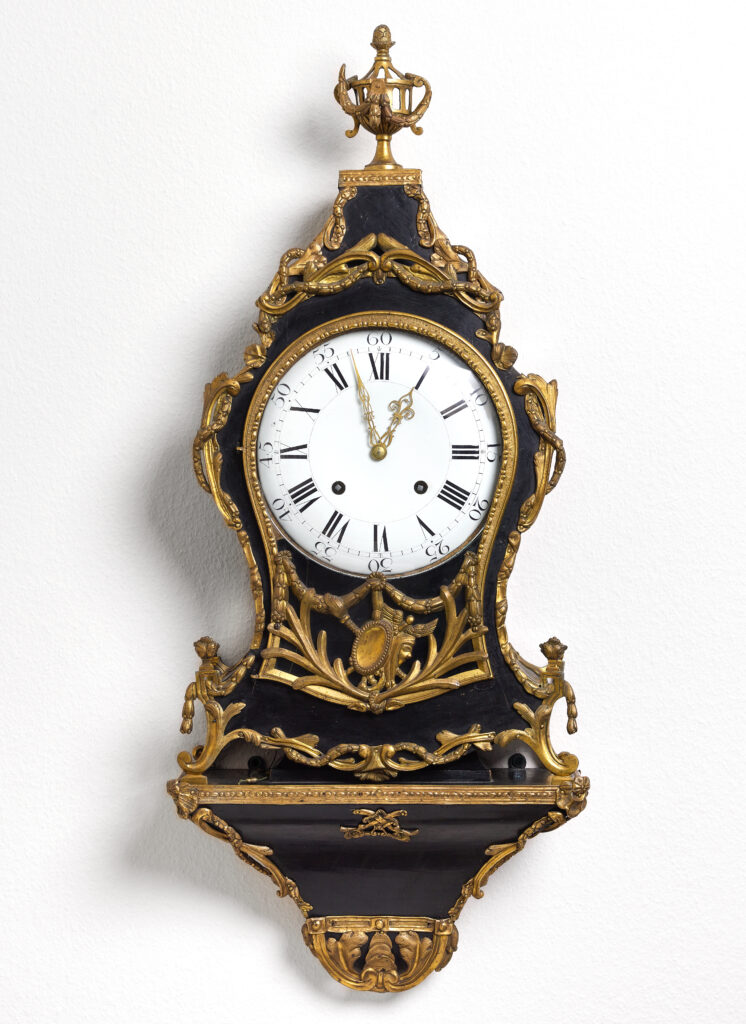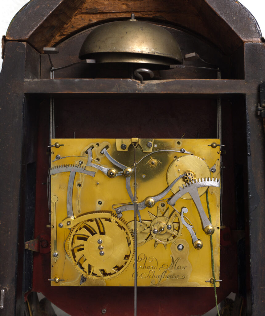 Die Pendule des Schaffhauser Stadtuhrmachers Erhard Moser besticht durch ihre üppigen Verzierungen. Der geschweifte, schwarz gefasste Gehäusekasten samt Wandsockel und abnehmbarer Bekrönung ist mit verspiegelten Messing- und Bronzebeschlägen besetzt. Als oberster Abschluss thront eine durchbrochene Vase mit Girlanden. Die Fronttüre ist in einem Rahmen gefasst und im unteren Teil mit einer durchbrochenen Dekoration versehen. Das weisse Emaillezifferblatt trägt schwarze, römische Stunden- und arabische Minutenzahlen. Auf dem Uhrwerk, mit Spindelgang und Dreiviertelstundenschlag auf zwei Glocken findet sich die eingravierte Signatur des «Erhard Moser à Schafhouse».